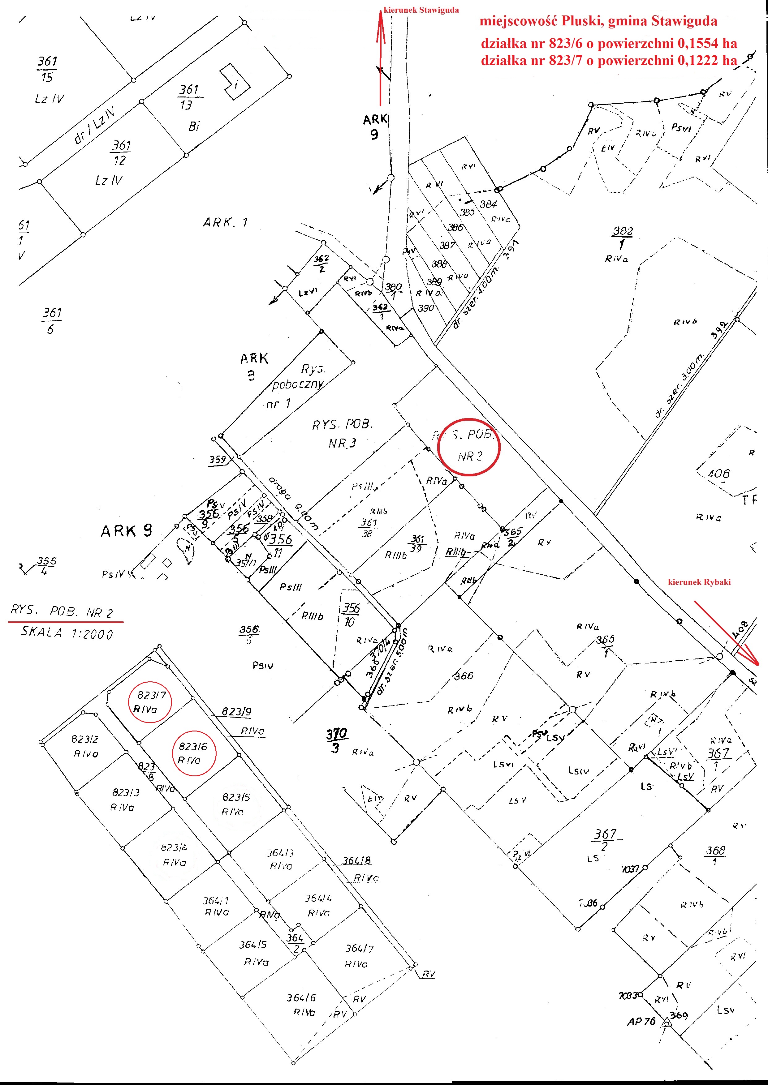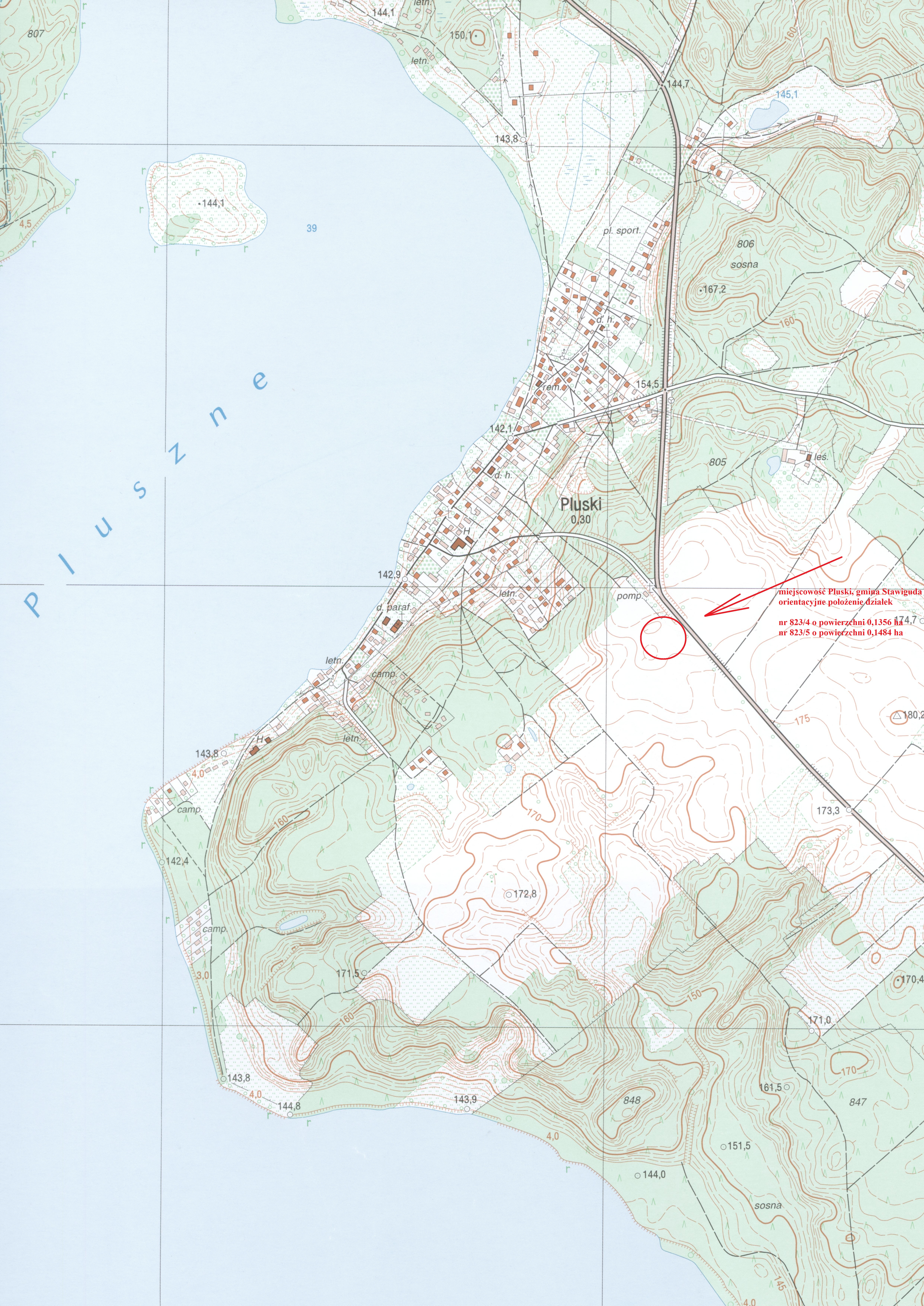 Działki niezabudowane o regularnym kształcie zbliżonym do kwadratu, zlokalizowane przy drodze gminnej, prowadzącej do wsi Rybaki. Sąsiedztwo stanowi zabudowa mieszkaniowa, rekreacyjna, tereny leśne i jezioro Pluszne (ok. 600 m).